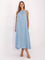 Der hochgeschlossene Rundhalsausschnitt mit feiner Kräuselung und die ärmellose Form machen das Kleid ideal für warme Tage.