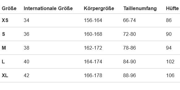 XS: Waist circumference - 68 cm, waist height - 35 cm, total length - 96 cm